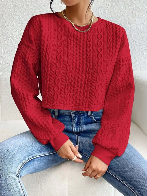 Elevate your casual style with this chic drop shoulder crop sweater, featuring a flattering round neck and relaxed fit. Its soft knit fabric and bold red color make it a standout piece that’s perfect for layering or wearing on its own.