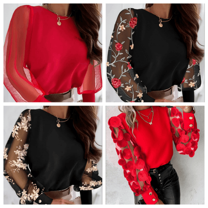 BloomFlor™ Women’s Flower Mesh Long-Sleeve Round Neck Tops